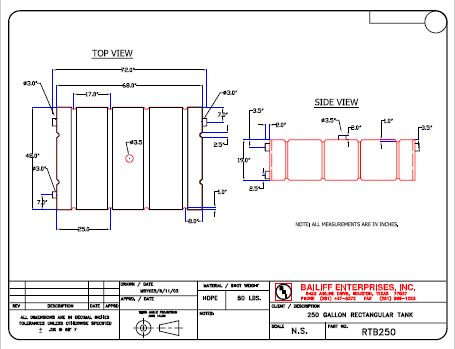 -- This tank is 68" long x 48" wide x 19" tall -- 250 gallon capacity. -- 1.9 specific gravity rating (15.8 pounds per gallon). -- FDA approved resin for food grade/potable water applications. -- Complies with FDA standards 21 CFR 177.1520 (1) 3.1 and 3.2. -- HDPE has a maximum continuous use temperature of 120 F. -- Translucent White in color. -- Type of tank: SINGLE WALL. -- Item number: MPTB00250-68.